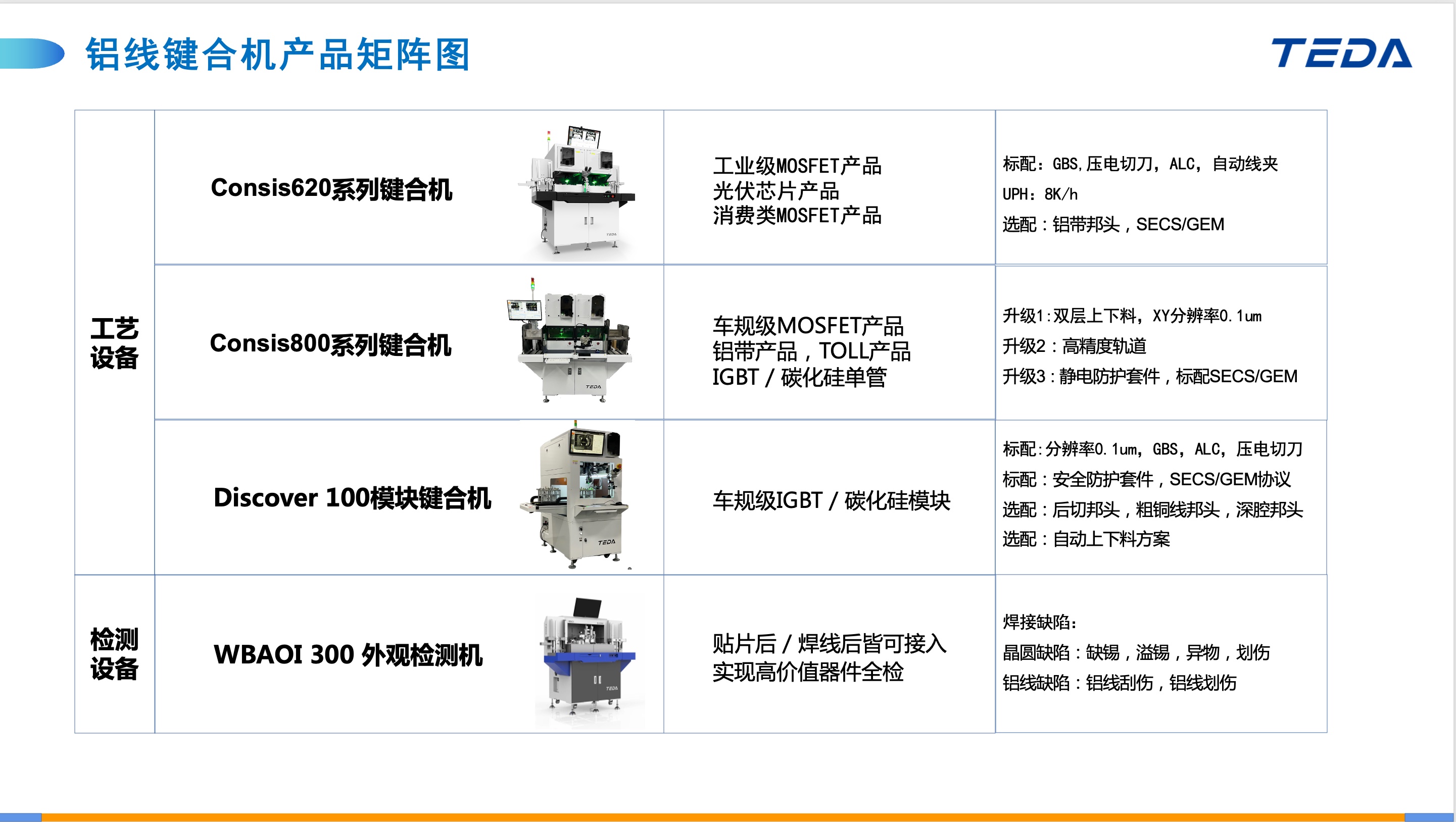 深圳市泰達智能裝備有限公司 泰達智能是深圳泰沃德技術全資子公司,專注于功率半導體封裝測試的鋁線鍵合工藝,團隊包括哈爾濱工業大學,華中科技大學等知名院校及半導體智能裝備行業的資深經營管理人才。 公司秉承“進口替代”的經營理念,產品對口平替美國半導體封測設備。同時,根據客戶的工藝要求,定制開發一些軟硬件解決方案??焖倨ヅ淇蛻粜庐a品的開發需求。 泰達智能設備依托于具有自主知識產品的超聲焊接工藝管理系統,高速高精的多軸運動控制系統,微米級精密設計與工藝系統經驗,為半導體客戶提供精度高,穩定性強,一致性好的高性價產品。